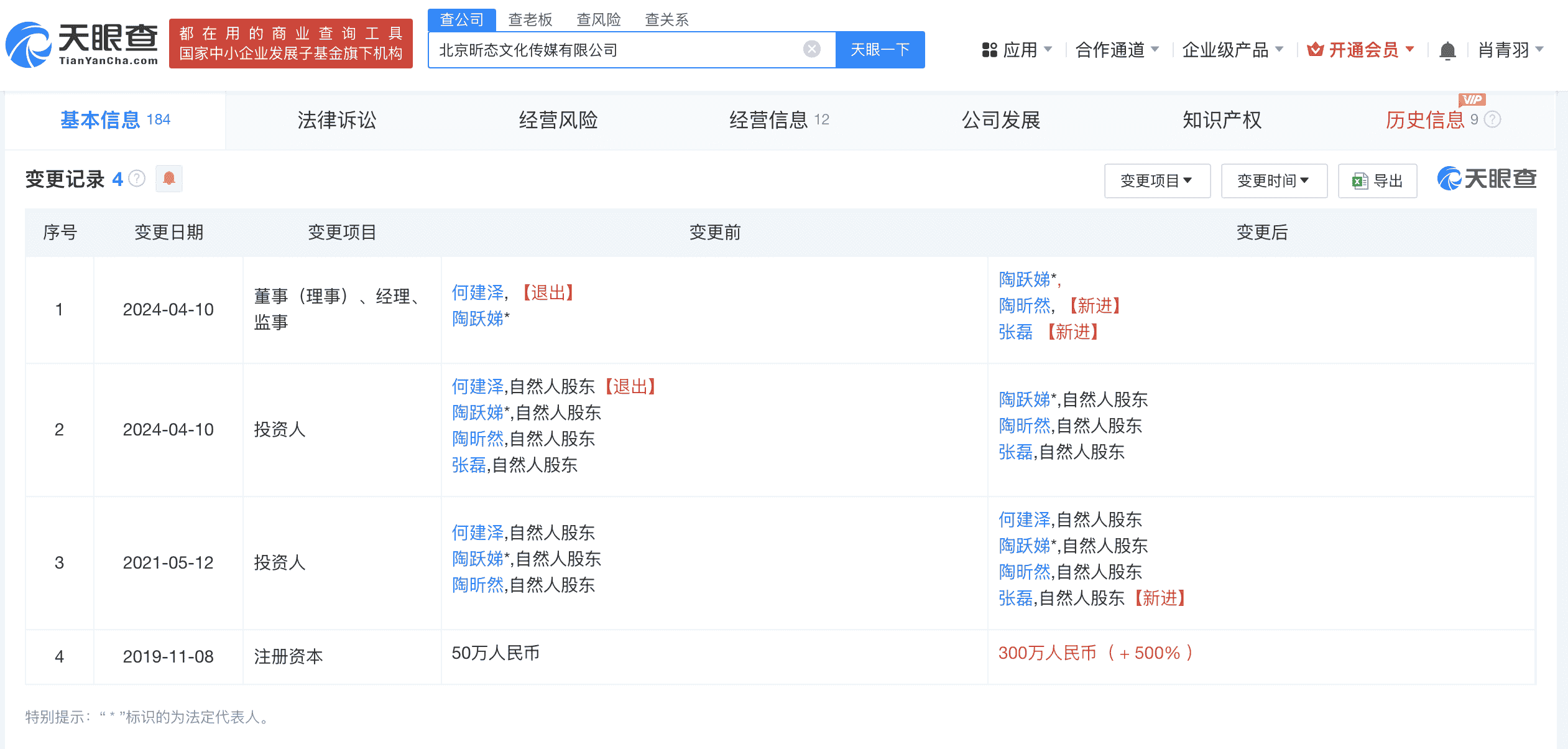 值得注意的是,就在陶昕然官宣离婚前不久,何建泽已悄然从其中两家公司——天津昕态文化传媒有限公司和北京昕态文化传媒有限公司中卸任了股东等重要职务。这一变动或许预示着两人商业关系的调整,也进一步加剧了外界对于他们婚姻状况的好奇与猜测。