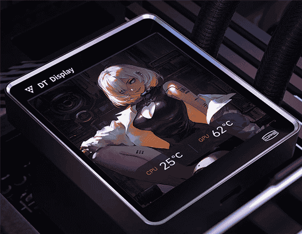 银翼DT360水冷散热器在外观设计上颇具亮点,它配备了一块独立的磁吸显示屏,这块屏幕的分辨率达到了480x480,刷新率则为60Hz,显示效果细腻流畅。散热器还采用了全铝CNC阳极喷砂工艺,边框部分经过高光切割处理,整体外观极具质感。
