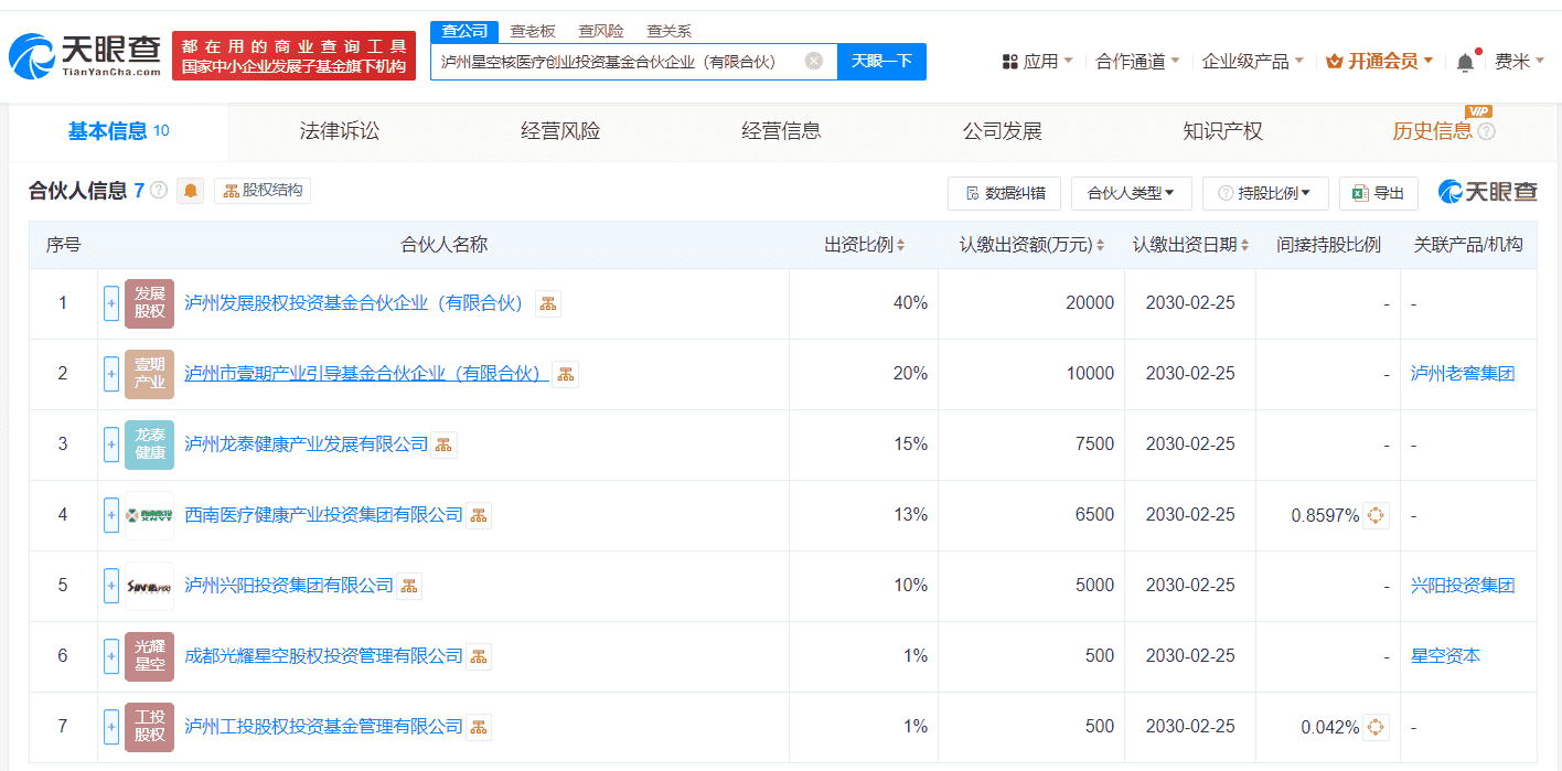 在合伙人方面,泸州星空核医疗创业投资基金合伙企业汇聚了多家实力雄厚的企业。据天眼查进一步揭示,该基金的出资方包括泸州发展控股集团旗下泸州发展股权投资基金合伙企业、泸州老窖集团旗下泸州市壹期产业引导基金合伙企业,以及泸州龙泰健康产业发展有限公司等。这些企业的共同参与,不仅彰显了该基金的强大背景,也预示着其在医疗健康领域的投资将具有广泛的影响力和深远的战略意义。