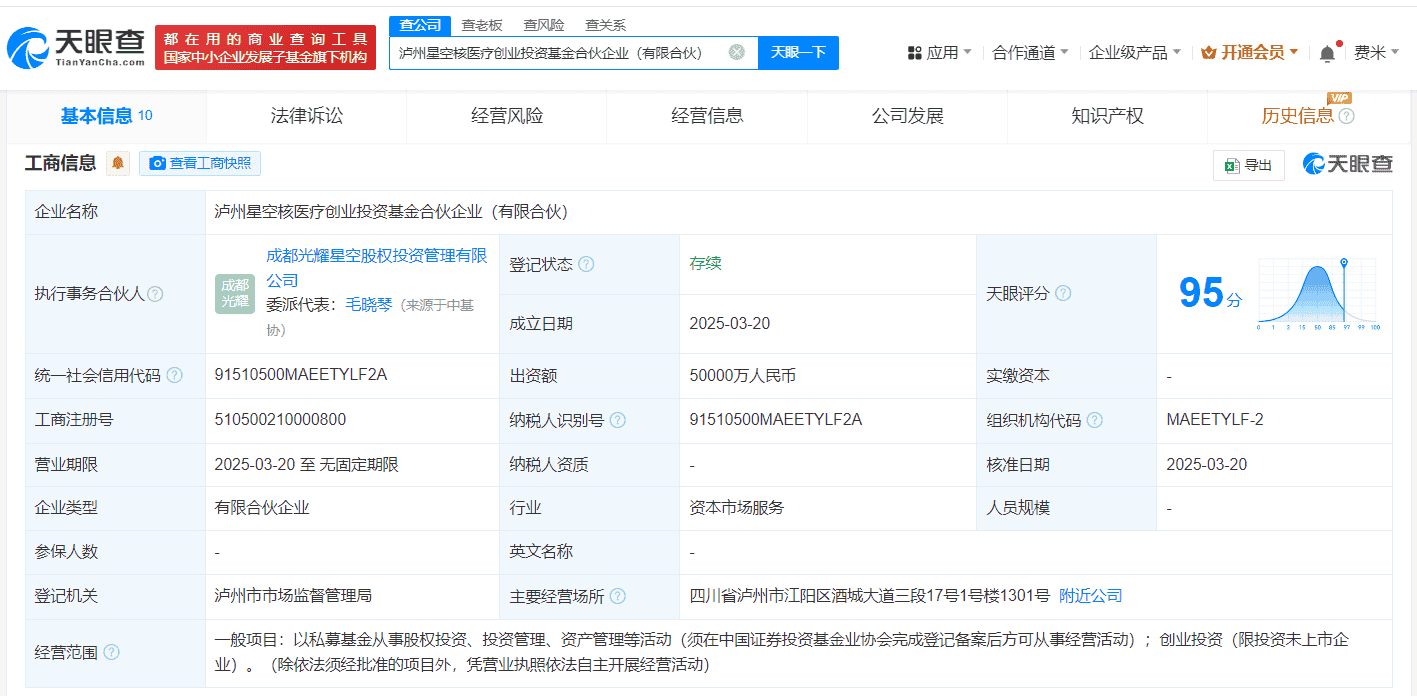 近日,一家名为泸州星空核医疗创业投资基金合伙企业的有限合伙企业正式成立,标志着泸州地区在医疗健康领域的投资布局迈出重要一步。据天眼查信息显示,该基金的执行事务合伙人为成都光耀星空股权投资管理有限公司,其出资额高达5亿元人民币。