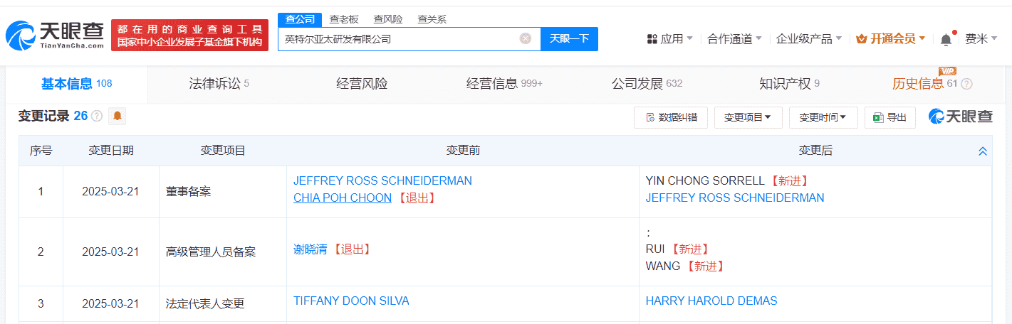 近期,英特尔亚太研发有限公司的高层人事变动引发了业界关注。据天眼查App最新数据显示,该公司已正式完成工商变更手续,其法定代表人由TIFFANY DOON SILVA变更为HARRY HAROLD DEMAS。