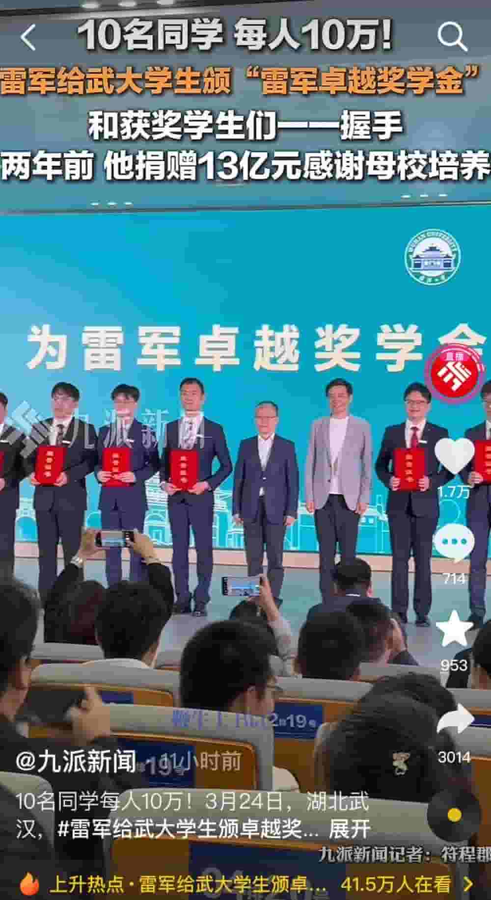 据九派新闻详细报道,雷军此行的一个重要目的是为武汉大学的学生颁发“雷军卓越奖学金”。在颁奖仪式上,他与每位获奖学生亲切握手,共计10名学生获得了这一殊荣,每人奖金高达10万元。这一慷慨之举无疑是对学生们努力学习的一种巨大鼓励和认可。