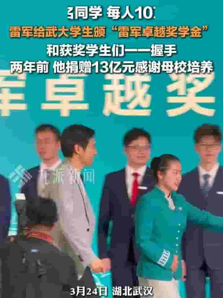 在校园里,雷军与武汉大学的学生们亲密互动,为他们颁发了一项特别的奖学金——“雷军卓越奖学金”。这一奖项是他为了进一步支持母校的教育事业,特别是在拔尖创新人才培养方面所设立的。在颁奖仪式上,雷军与获奖的10名学生一一握手,并为每人颁发了10万元的奖金。这一慷慨之举无疑是对学生们努力的极大肯定和鼓励。