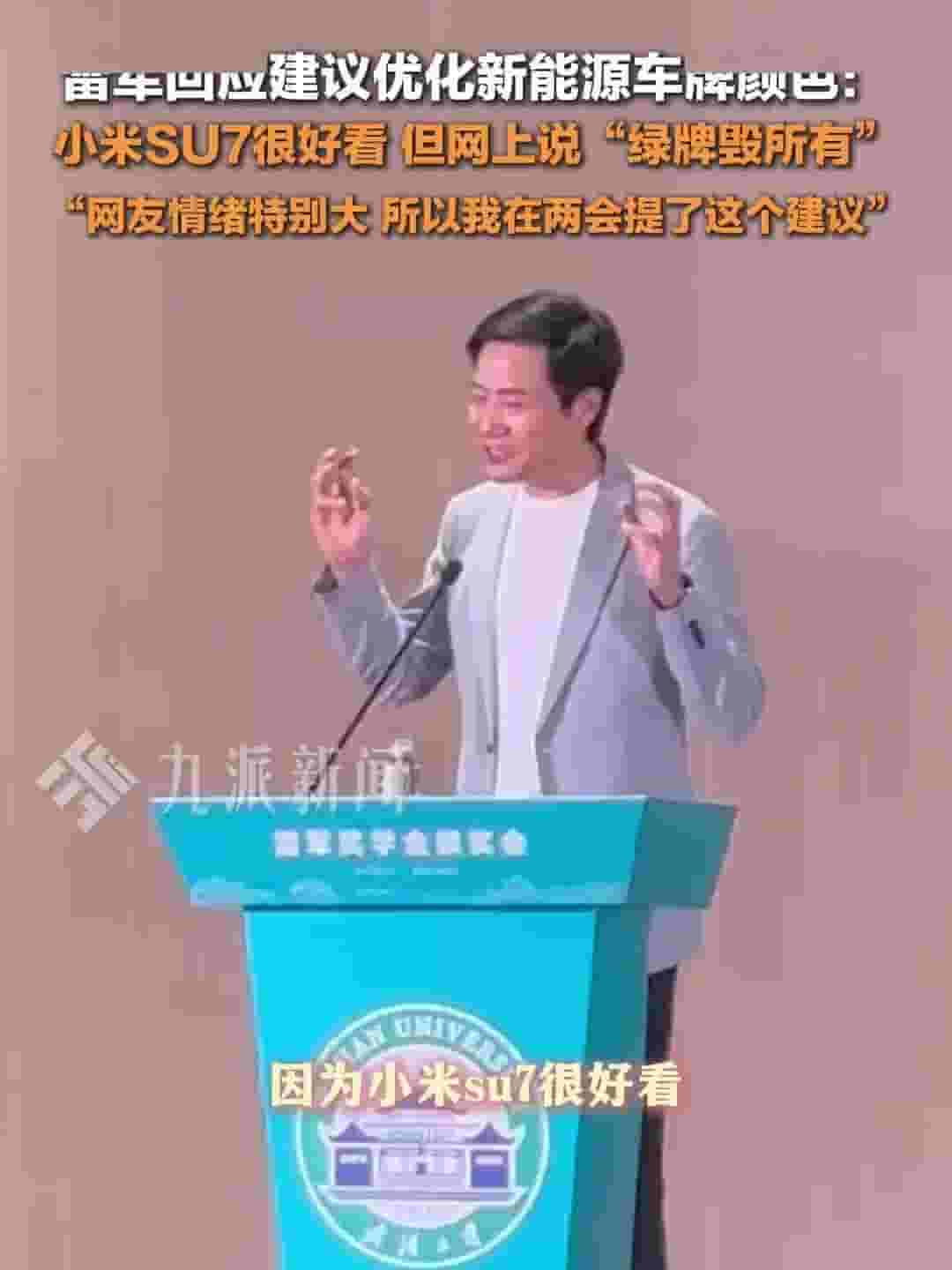 雷军还就新能源车牌颜色的问题发表了自己的看法。他提到,自己曾建议优化新能源车牌颜色,因为小米的SU7车型虽然很好看,但网友们却认为绿牌毁了整体美感。雷军表示,他感受到了网友们的强烈情绪,因此在两会上提出了这个建议。