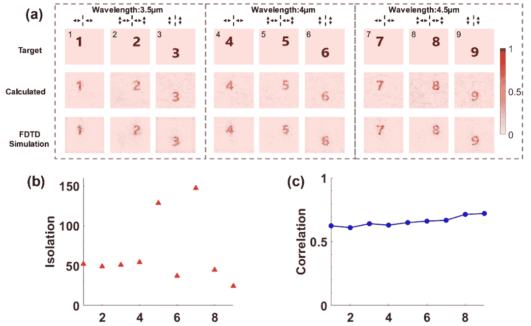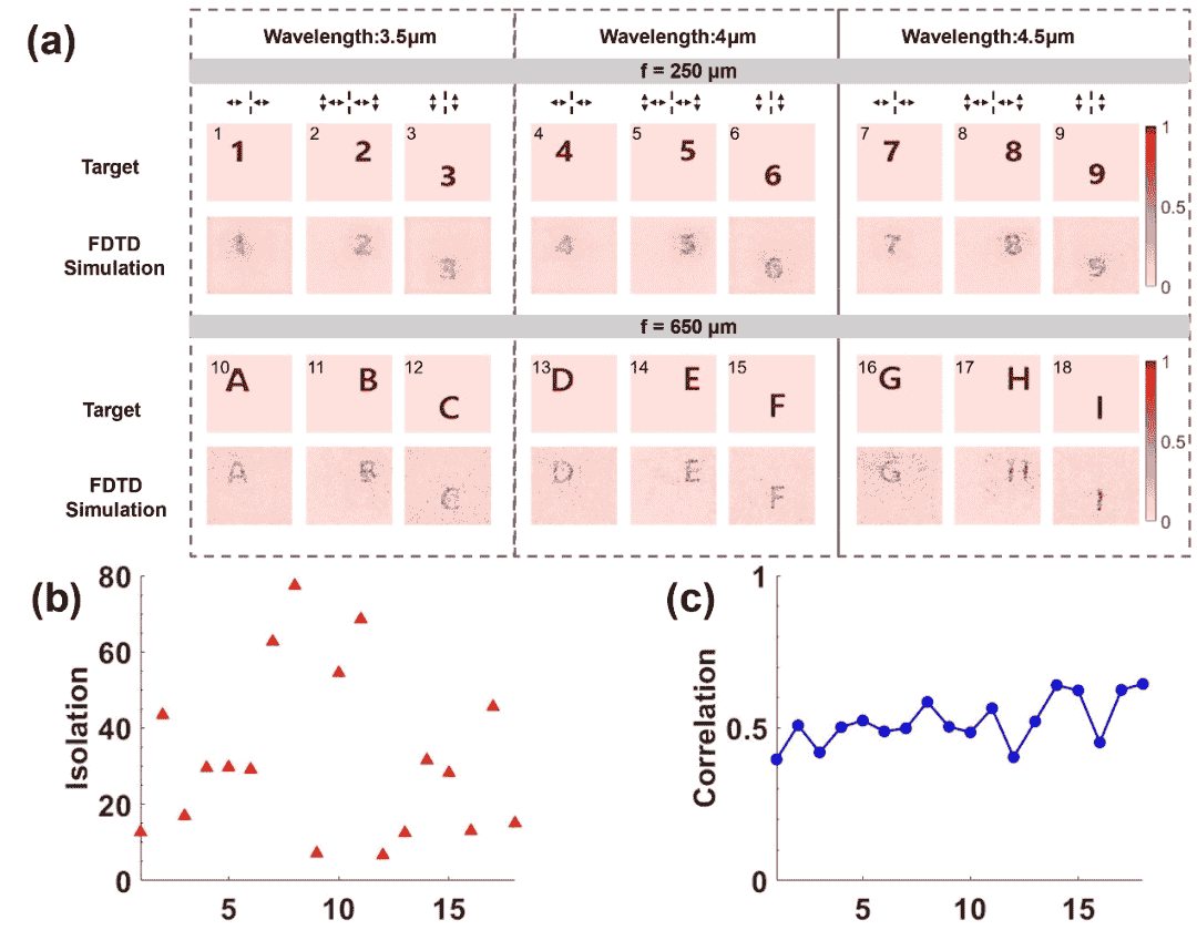 为了验证这一创新设计的有效性,研究团队利用FDTD仿真软件对两个具有代表性的非交错型超表面器件进行了测试。结果表明,他们所提出的逆向设计方法不仅实现了高隔离度的极多信道数量多维复用,还保持了高保真度的全息图像再现。在波长信道和偏振态信道的复用基础上,团队进一步引入了空间距离作为复用维度,设置了两个不同的焦平面,从而综合生成了18个波长-偏振态-衍射距离多维复用信道。