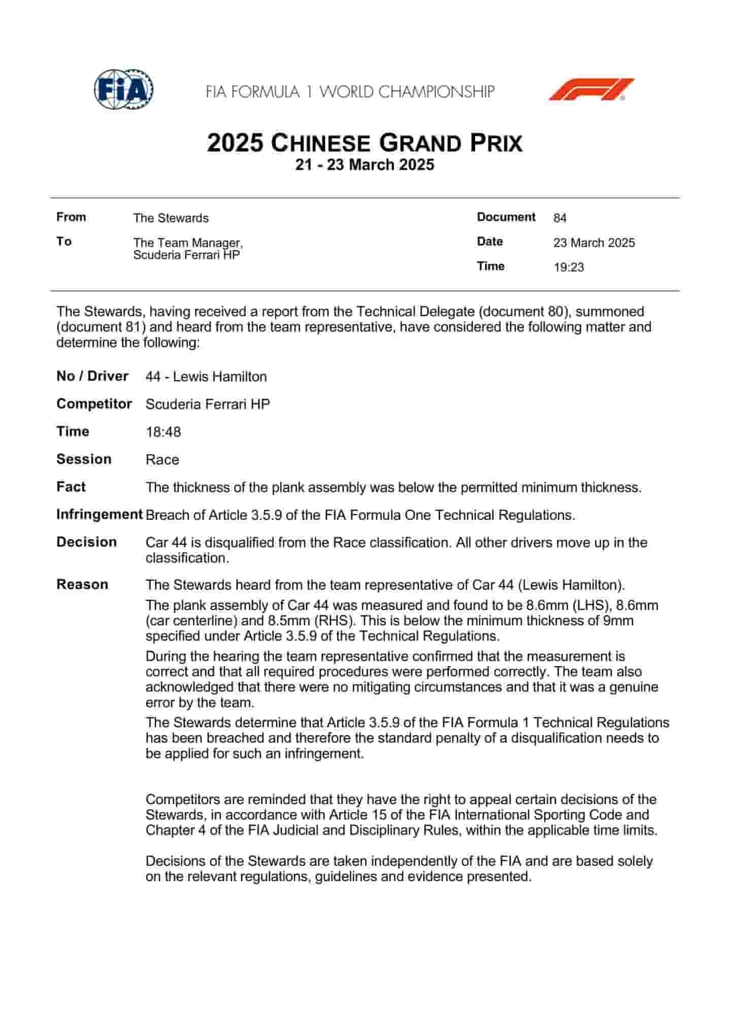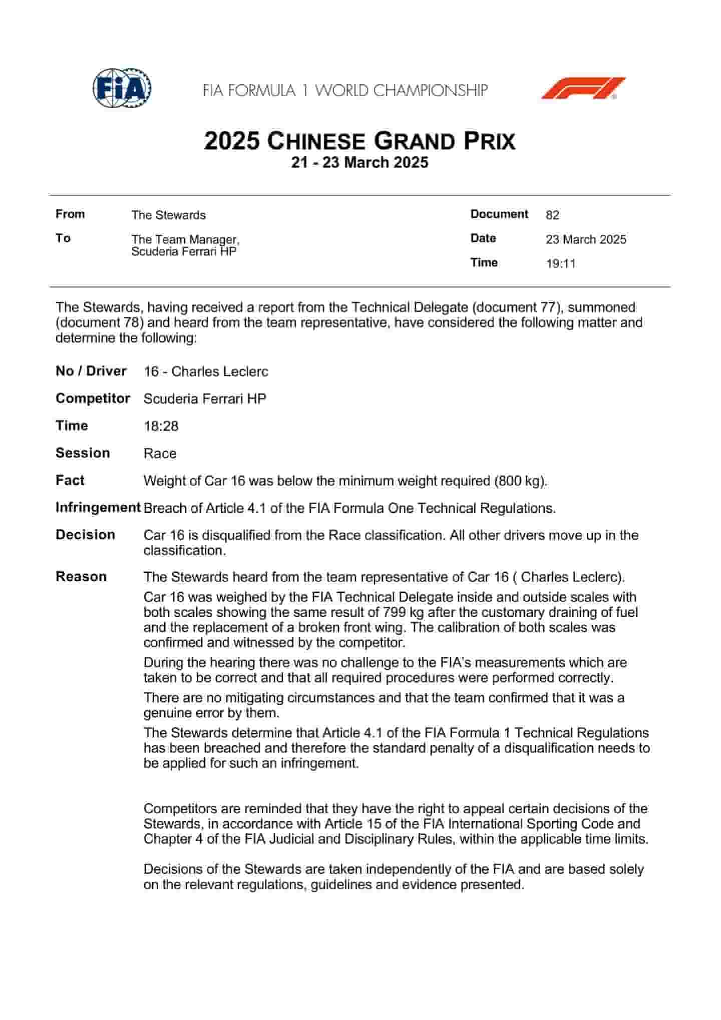 据赛事技术审查结果显示,法拉利车队的两台赛车均因不同原因未能达标。其中,勒克莱尔驾驶的16号赛车重量比规定标准少了1KG,而汉密尔顿的44号赛车底部木板则比规定厚度薄了0.5MM。法拉利车队随后发表声明,对比赛结果表示遗憾,并解释了导致赛车不合规的具体原因。