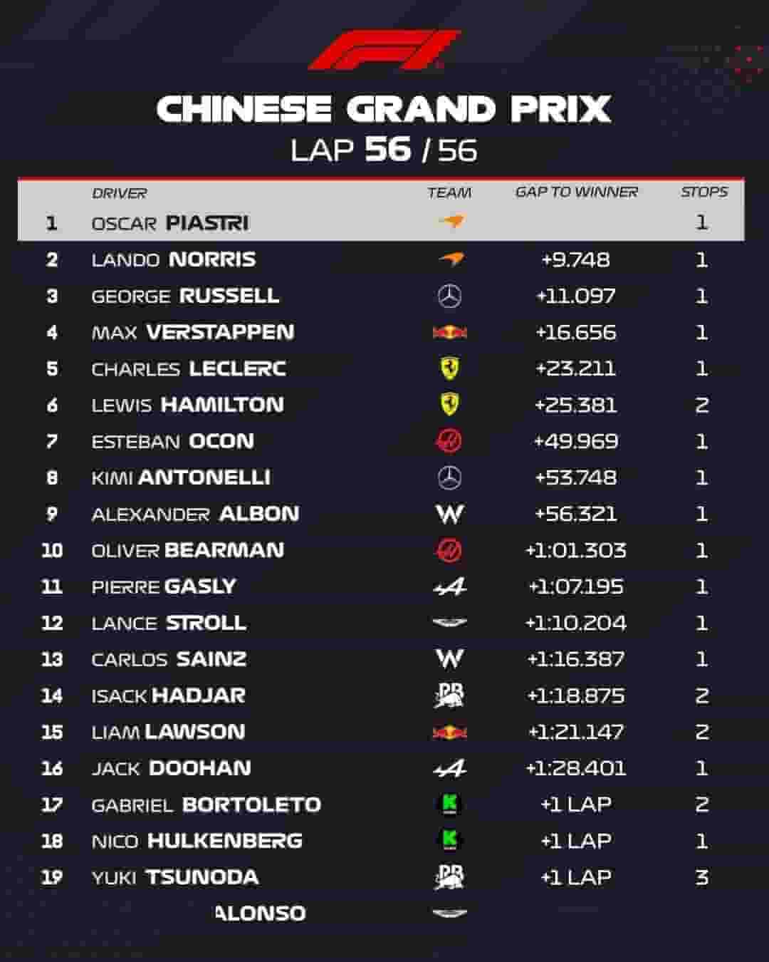 随着加斯利、勒克莱尔和汉密尔顿三位车手的成绩被取消,2025年F1中国大奖赛的排名也发生了重大变化。更新后的排名前十名分别为皮亚斯特里、诺里斯、拉塞尔、维斯塔潘、奥康、安东内利、阿尔本、贝尔曼、斯托尔和塞恩斯。