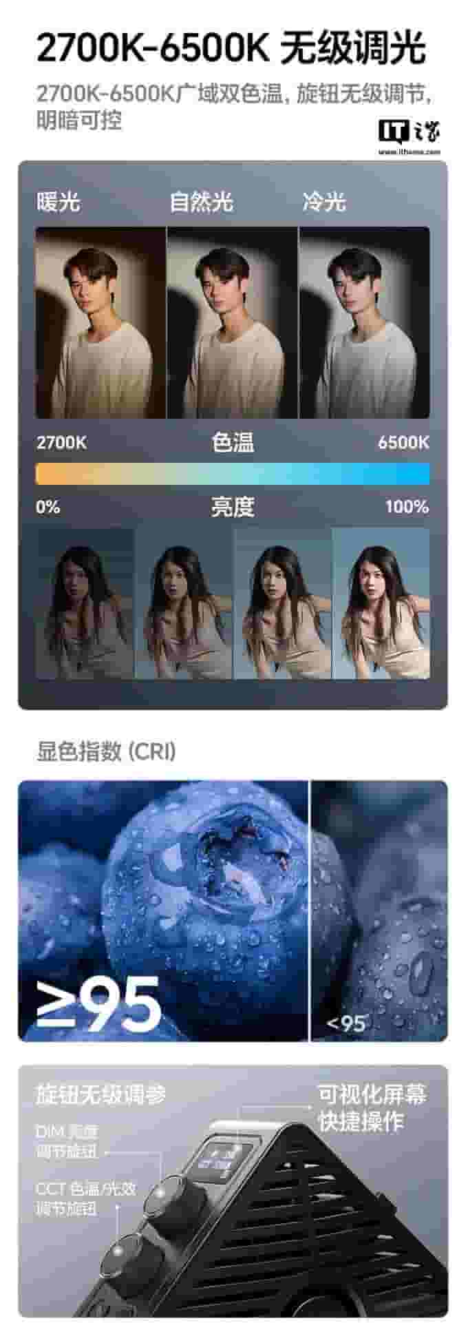 “小方灯”以低调的外观和模块化设计著称,整体重量控制在250克左右,便于携带和操作。其锂电分离设计让用户可以根据需求自由更换电池,同时支持DC电源适配器及USB-C供电,大大提升了使用的便捷性。摄影灯还配备了一块副屏,以及亮度与色温/光效旋钮,使得调参过程更加直观和高效。