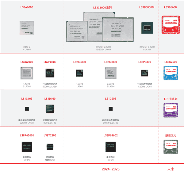 龙芯3C6000系列将包括S、Q、D等多个版本,采用LA664微架构,核心数从16到64不等,主频范围为2.0-2.2GHz。而龙芯3B6000M则集成了最多8个LA364微架构核心,主频在2.0-2.4GHz之间。龙芯二号家族还将在明年新增龙芯2K2500。