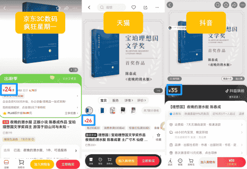 完全相同的正版图书在不同的平台下单也会出现差价。例如《夜晚的潜水艇》在京东3C数码“疯狂星期一”的价格为24.9元,在天猫的价格为26元,比京东贵了1.1元;在抖音的价格为35元,比京东贵了10.1元,京东价格相当于抖音的7折了。