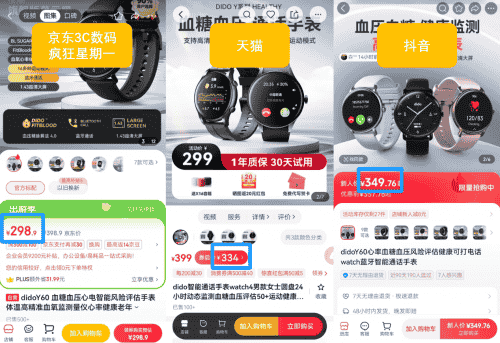 以dido Y60智能手表为例,这款手表在天猫的到手价为334元,在抖音的价格为349.76元,而在京东3C数码“疯狂星期一”的售价为298.9元,相当于天猫的9折,抖音的85折。只要在下单前先比价就能轻松省下差价的钱。