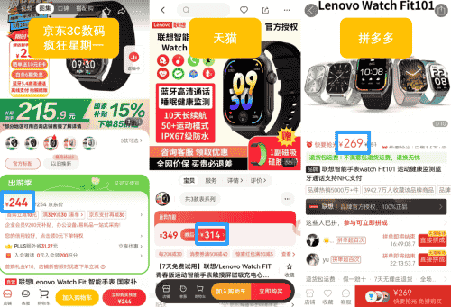 同样的还有联想Watch Fit,在京东3C数码“疯狂星期一”的售价为244元,并且还能使用国家补贴再减15%。而在天猫这款手表的价格为314元,比京东贵了70元;在拼多多的价格为269元,比京东贵了25元。
