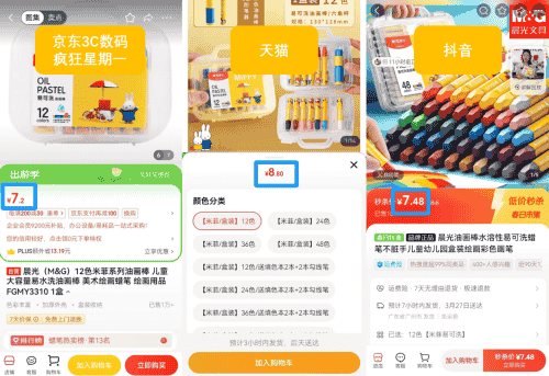 即使是个位价的文具产品也有差价的问题。晨光12色米菲系列油画棒,在京东3C数码“疯狂星期一”的售价为7.2元,在天猫的价格为8.8元,在抖音的到手价为7.48元,还是京东更便宜。