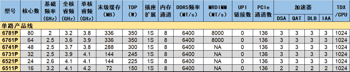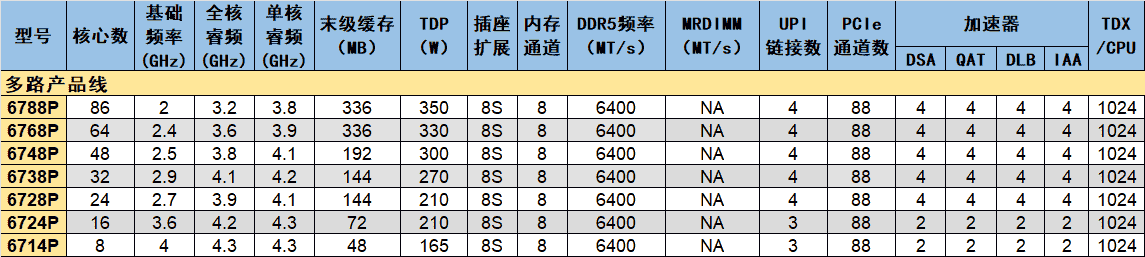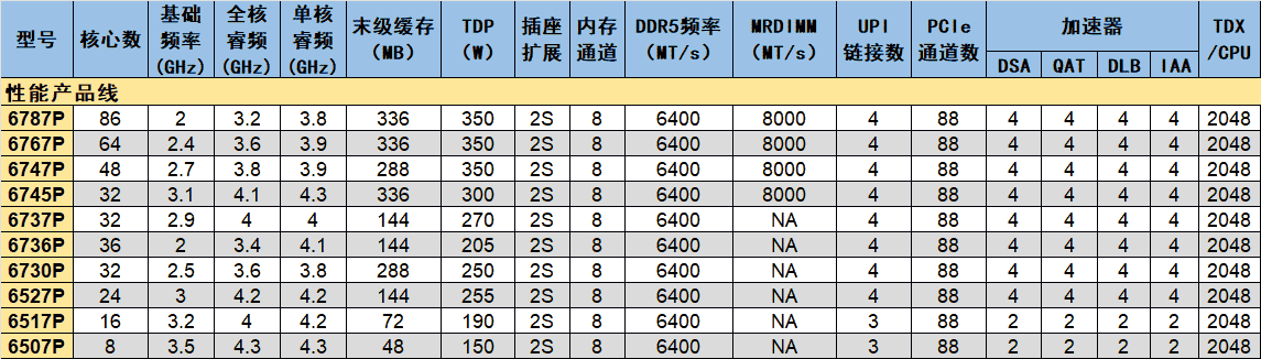 高性能产品线提供了最多86核的型号(6787P),多数型号的加速器全部打开。至强6的每个IO单元提供2个加速器模块,每个模块有DSA、QAT、DLB、IAA各1。两个IO单元就是4种加速器各4个。基于LCC的6517P 和 6507P提供的加速器是各两个。