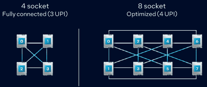 多路产品线是为4路、8路服务器准备的,售价较高,均被列入67xxP序列。该产品线的型号也比较容易理解,第三位数字大致对应了核数多寡;第四位数字是8或4,清晰体现了其原生的UPI直连多路支持能力。譬如6724P和6714P基于LCC,每个插槽有3个UPI链接,正好可以分别直连其他3个插座以构成全连接的4路系统,或通过节点控制器实现8路。其余尾数为8的处理器都有4个UPI,可以构成典型的8路系统。