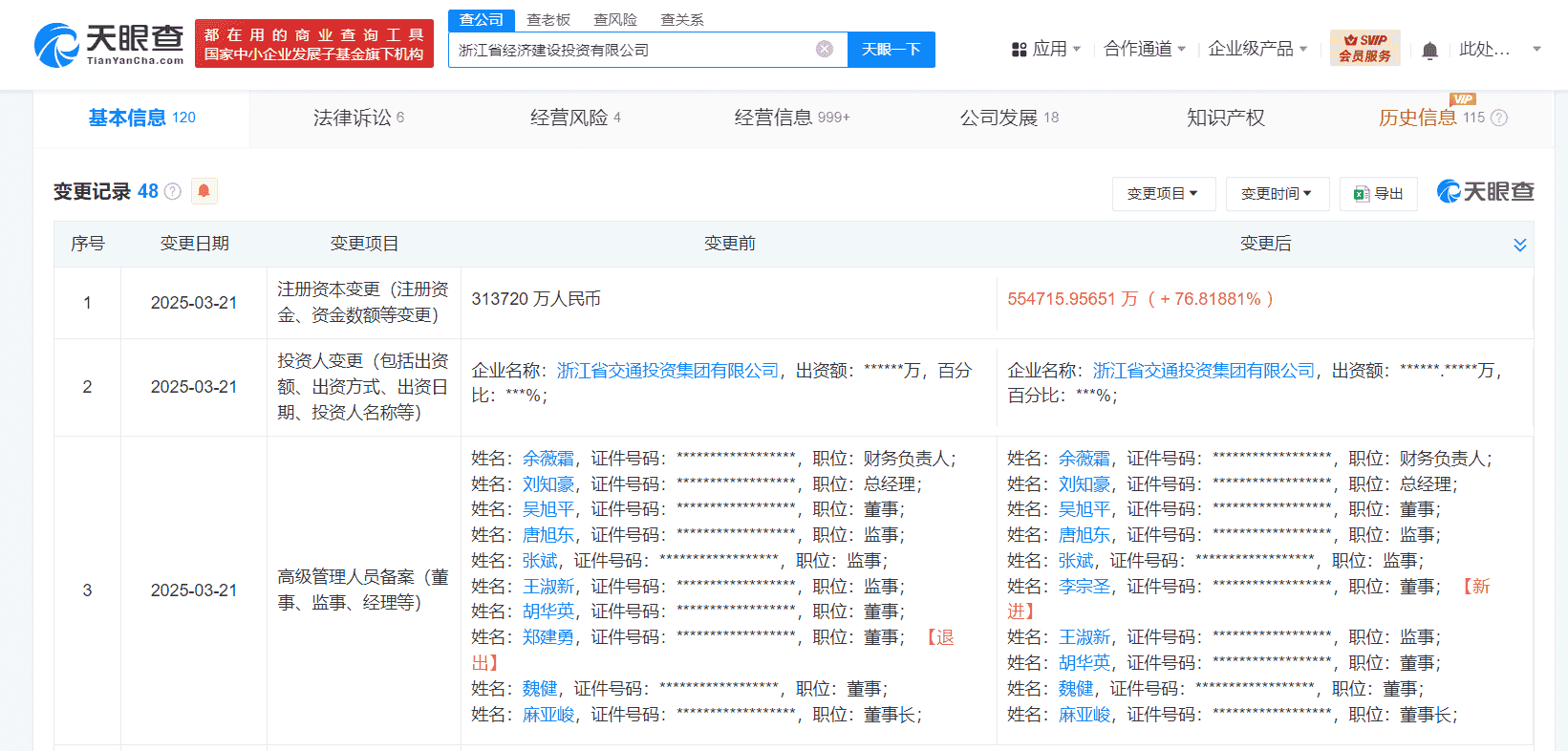 近期,浙江省经济建设投资有限公司经历了一次重要的工商变更,其注册资本实现了大幅度增长。据天眼查信息显示,该公司的注册资本已从原先的约31.37亿元人民币增加至约55.47亿元人民币,增幅高达约77%。