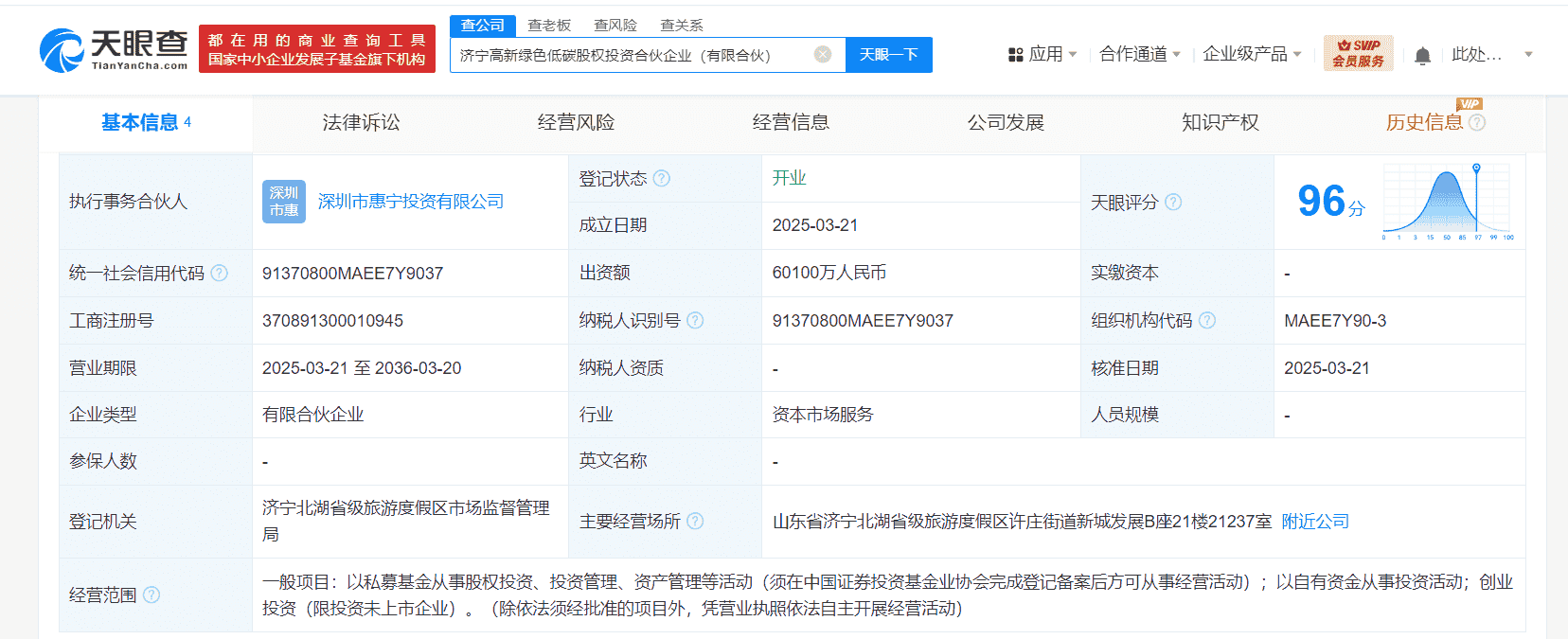 进一步查阅天眼查信息,我们发现济宁高新绿色低碳股权投资合伙企业的出资方背景强大。该企业由济宁高新产业投资集团有限公司与深圳市惠宁投资有限公司共同出资设立,这样的组合无疑为其在绿色低碳领域的深耕细作提供了坚实的资金支持与丰富的行业经验。