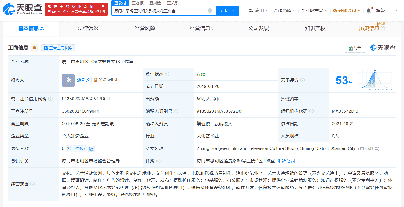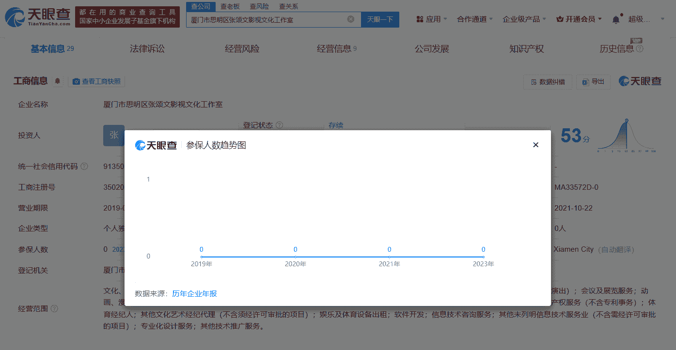 进一步查阅天眼查数据发现,尽管张颂文影视文化工作室的经营范围广泛,但在过去几年中,其参保人数一直为零。这一信息也引发了外界对于工作室运营状态的猜测和讨论。