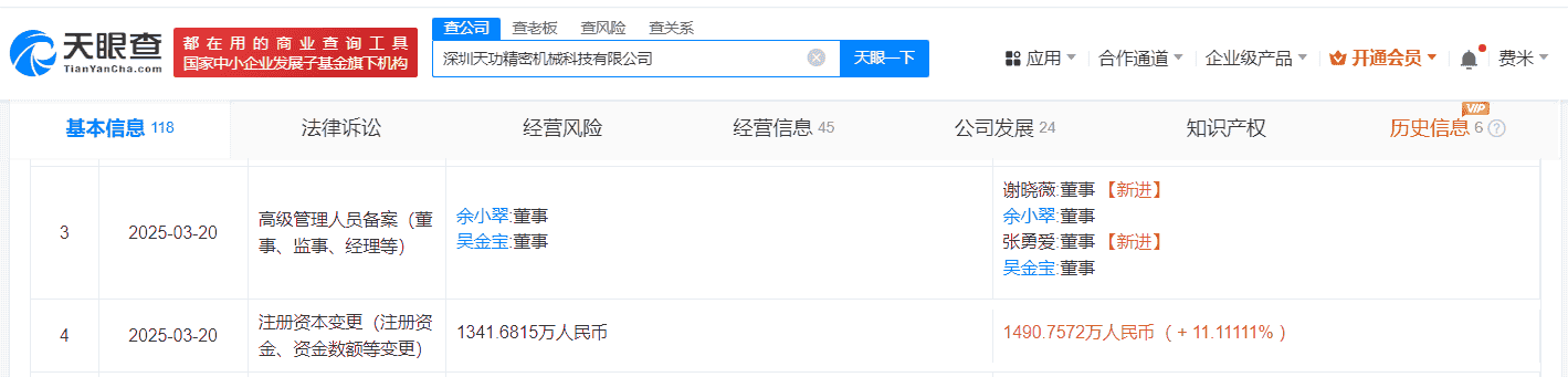 近期,深圳天功精密机械科技有限公司的工商登记信息出现了重要变动,小米集团旗下的瀚星创业投资有限公司正式成为其新增股东。与此同时,该公司的注册资本也由原来的约1342万人民币增长至约1491万人民币,标志着其在资金实力上的进一步增强。