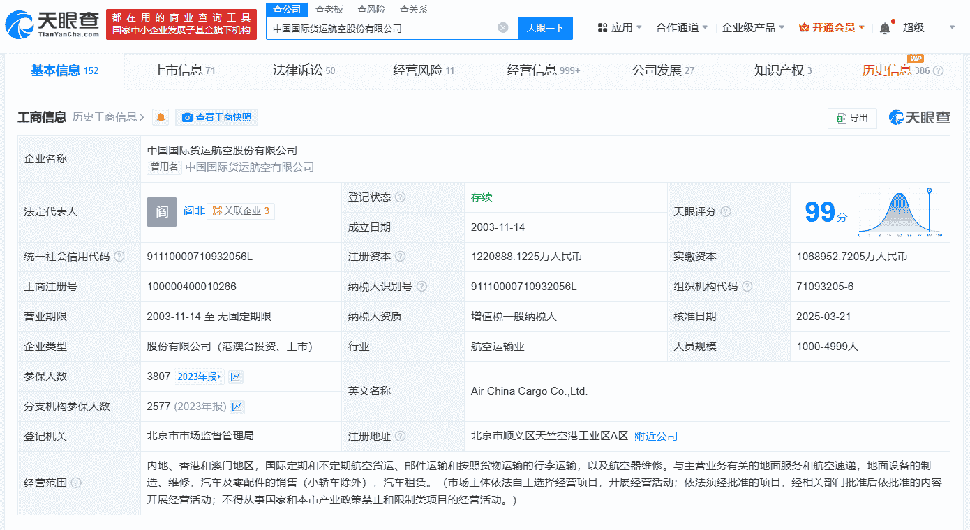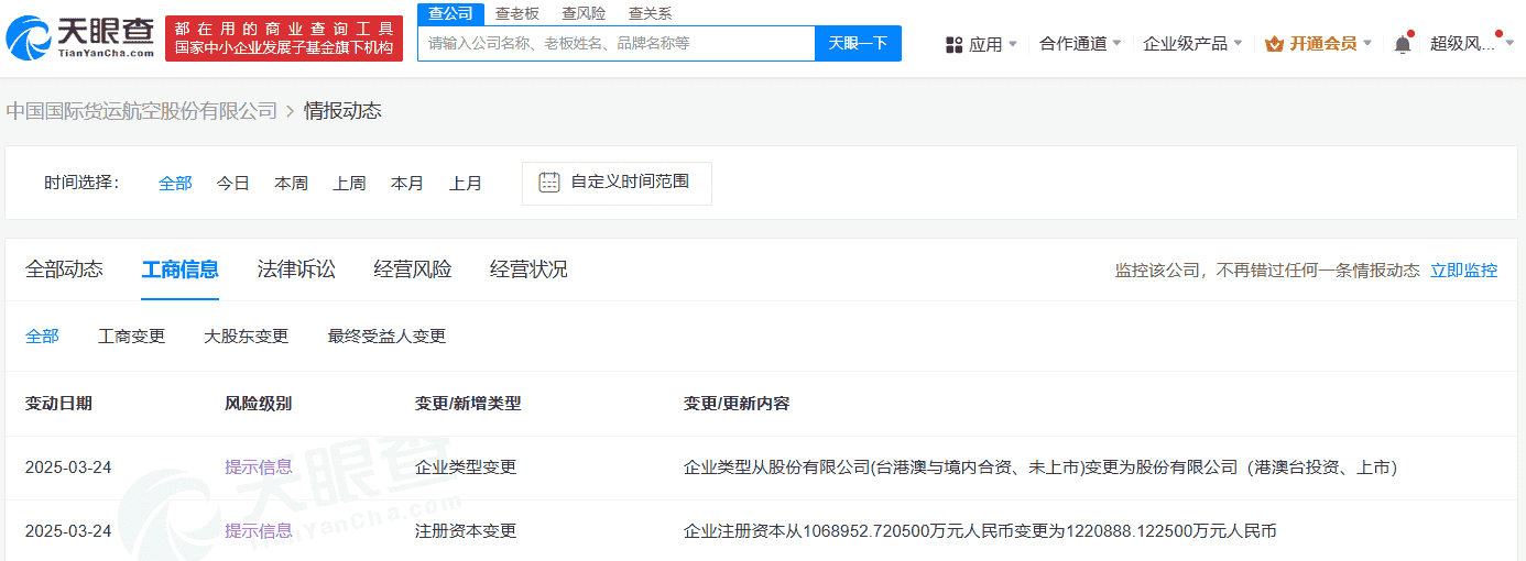 近日,中国国际货运航空股份有限公司发生了一项重要的工商变更,其注册资本实现了显著提升。据天眼查信息显示,该公司的注册资本已从约106.9亿元人民币增加至约122亿元人民币,这一变动标志着中国国际货运航空在资本实力上的进一步增强。