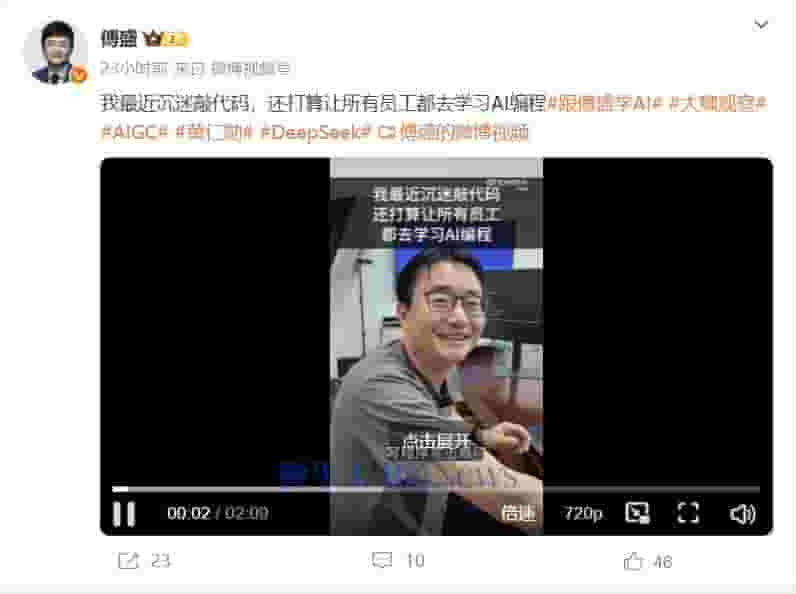 猎豹移动公司的首席执行官傅盛近日在社交媒体上发布了一段视频,透露了他近期的一项新爱好——编写代码,并表达了希望公司全体员工都能掌握AI编程技能的愿景。