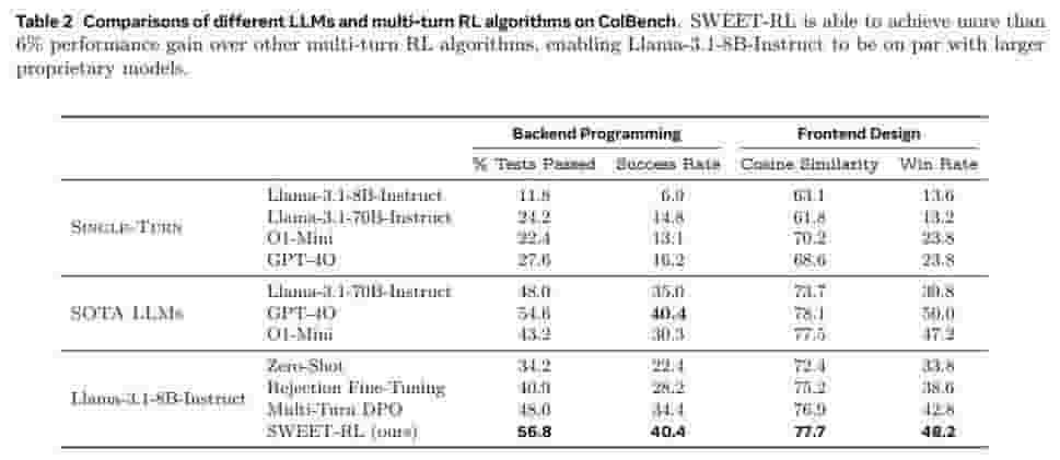实验结果显示,SWEET-RL在后端编程任务中的通过率显著提升至48.0%,在前端设计任务中的余弦相似度也达到了76.9%,这一成绩显著优于其他多轮强化学习方法。这一突破性的进展,无疑为LLMs在多轮人机协作任务中的应用开辟了新的道路。