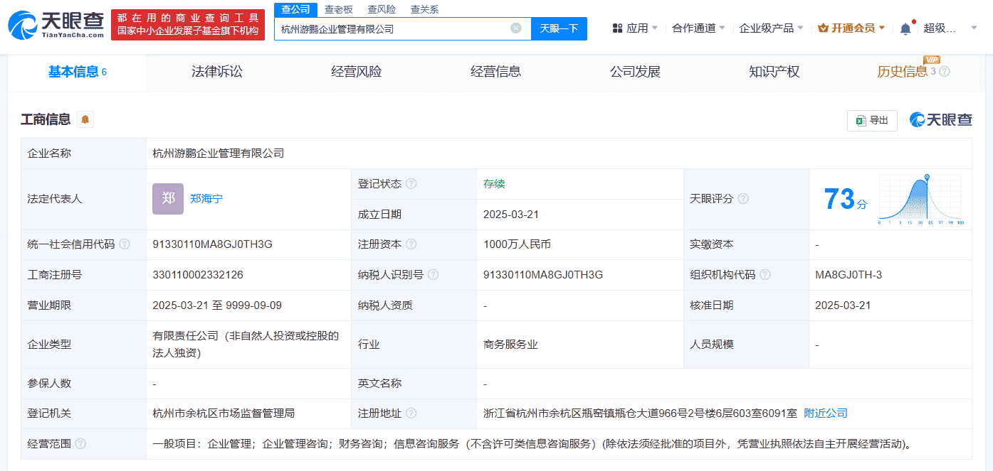 近日,一家名为杭州游鹏企业管理有限公司的新企业正式成立,该公司的法定代表人是郑海宁。据天眼查信息显示,该公司的注册资本为1000万人民币,业务范围涵盖了企业管理、企业管理咨询、财务咨询以及信息咨询服务等多个领域。