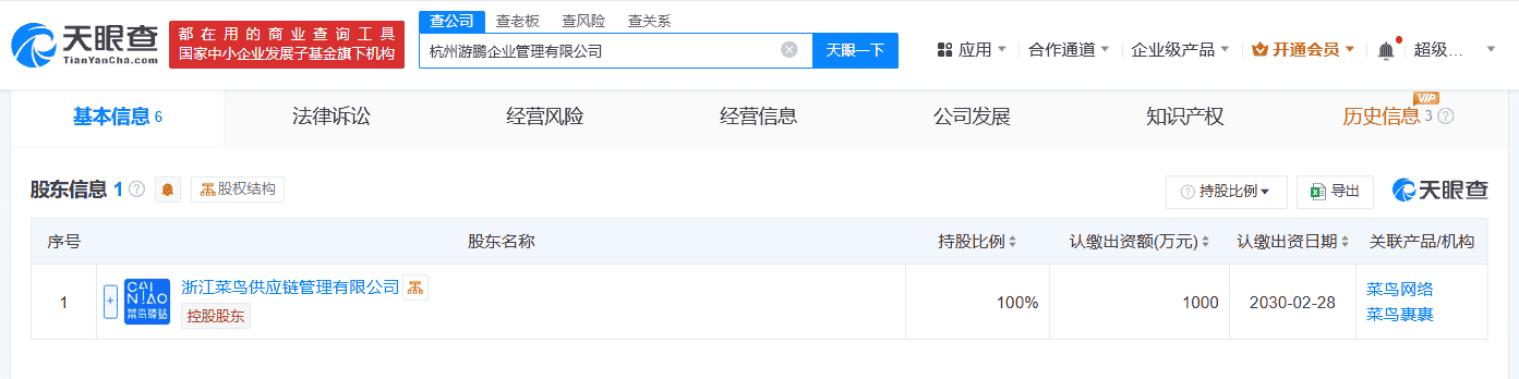 菜鸟杭州新设游鹏企管,注册资本高达千万!