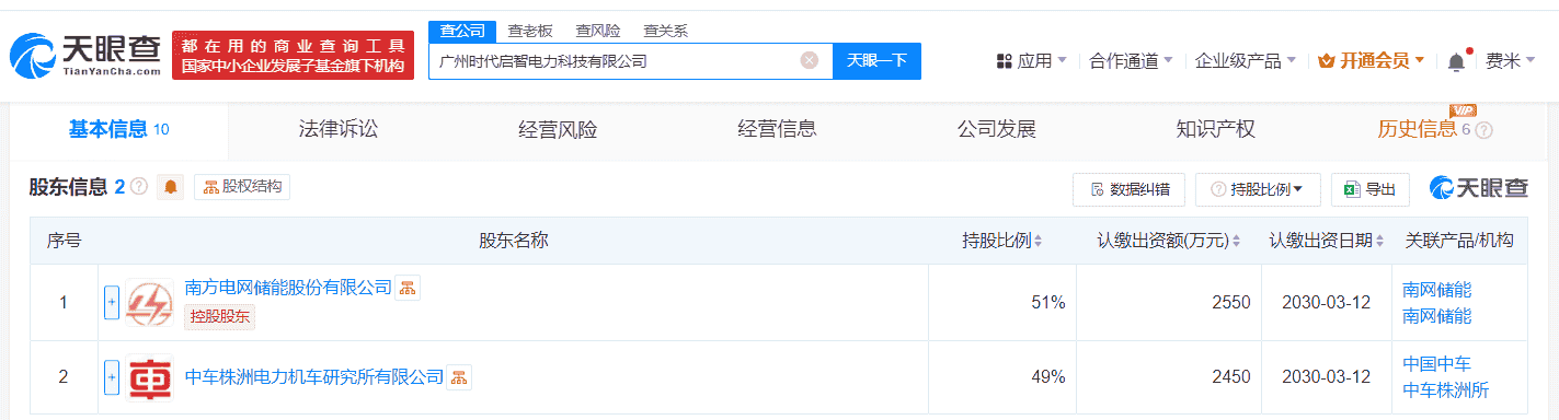 在股东结构方面,该公司由两大实力股东共同持股。其中,南网储能(股票代码:600995)作为中国领先的储能解决方案提供商,其加入无疑为广州时代启智电力科技有限公司注入了强大的技术支持和市场资源。而中国中车(股票代码:601766)旗下的中车株洲电力机车研究所有限公司,也在电力机车和新能源领域拥有深厚的技术积累和丰富的市场经验,其持股进一步增强了新公司的技术实力和市场竞争力。