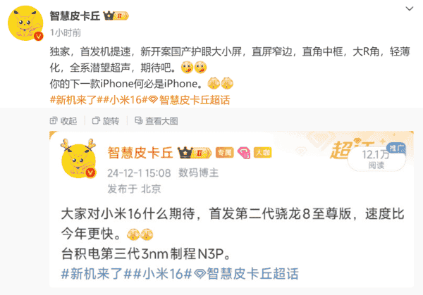 尽管博主并未直接点名这款神秘新机的型号,但他在微博中附上了一张历史截图,图中隐约可见“小米16系列”的字样。据此推测,小米16系列或将率先搭载第二代骁龙8至尊版处理器,该处理器基于台积电第三代3nm制程工艺打造,性能表现值得期待。