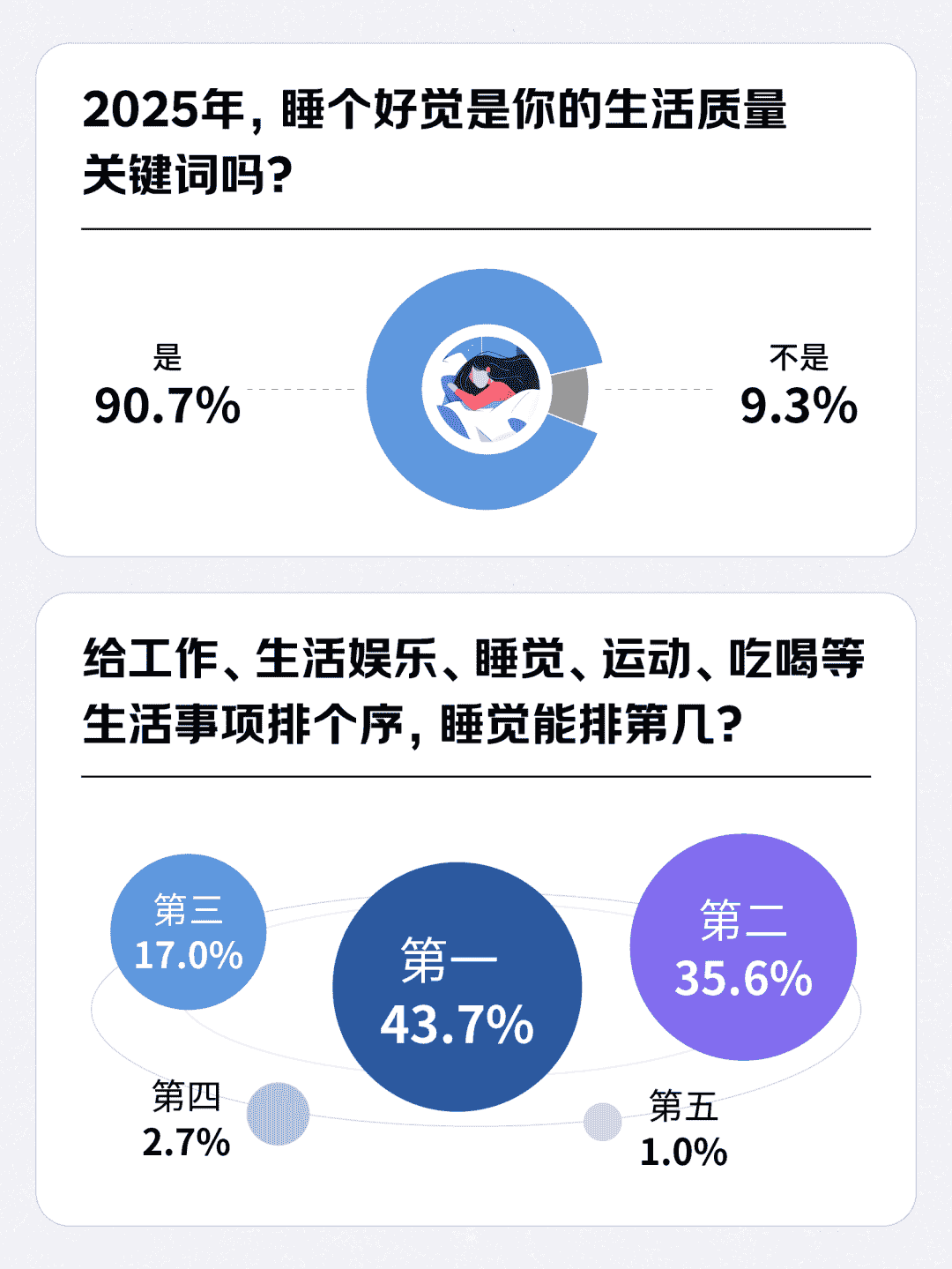 对于许多人来说,“睡个好觉”已经成为他们生活的核心目标。在各项生活事项的排序中,睡觉往往占据前列。意识到睡眠问题的重要性,并愿意采取行动来改善它,是夺回生活主权的第一步。随着睡眠意识的觉醒,睡眠经济也应运而生,为年轻人提供了更多重构生活秩序的工具。
