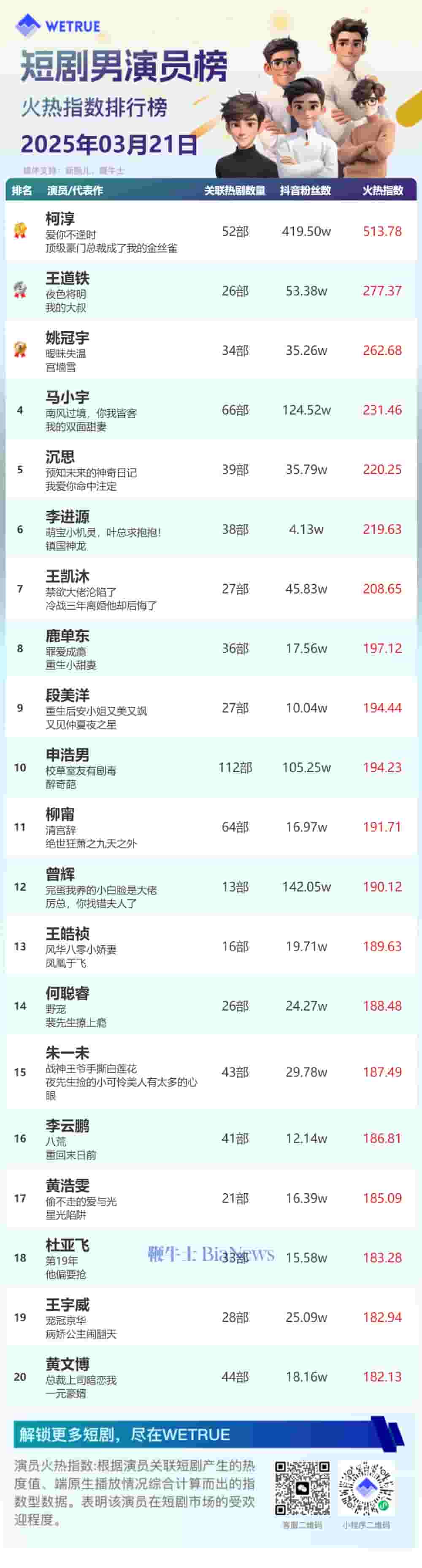 男演员榜单同样竞争激烈,多位在短剧中有着出色发挥的男艺人占据了榜单前列,他们通过精彩的表演和深刻的角色塑造,赢得了广大观众的喜爱。