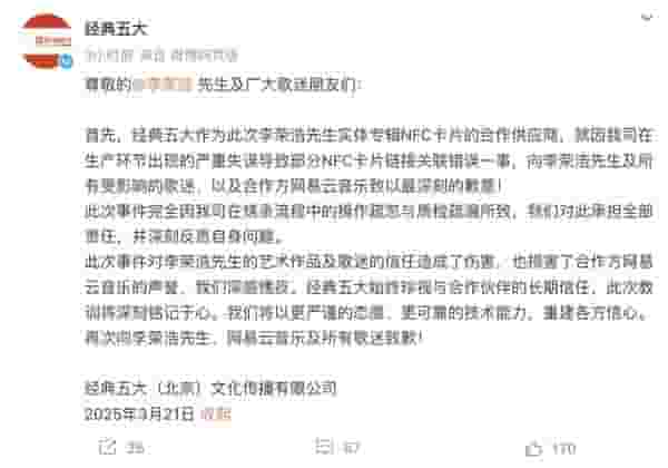 面对李荣浩的质问,网易云音乐官方迅速作出回应并致歉。据网易云音乐解释,此次事件是由于李荣浩工作室指定的供应商“经典五大”在制作实体专辑时出现的疏漏所致。具体来说,是“经典五大”在NFC卡片烧录过程中错误地植入了链接,并且在后续的质检环节中未能及时发现这一错误。