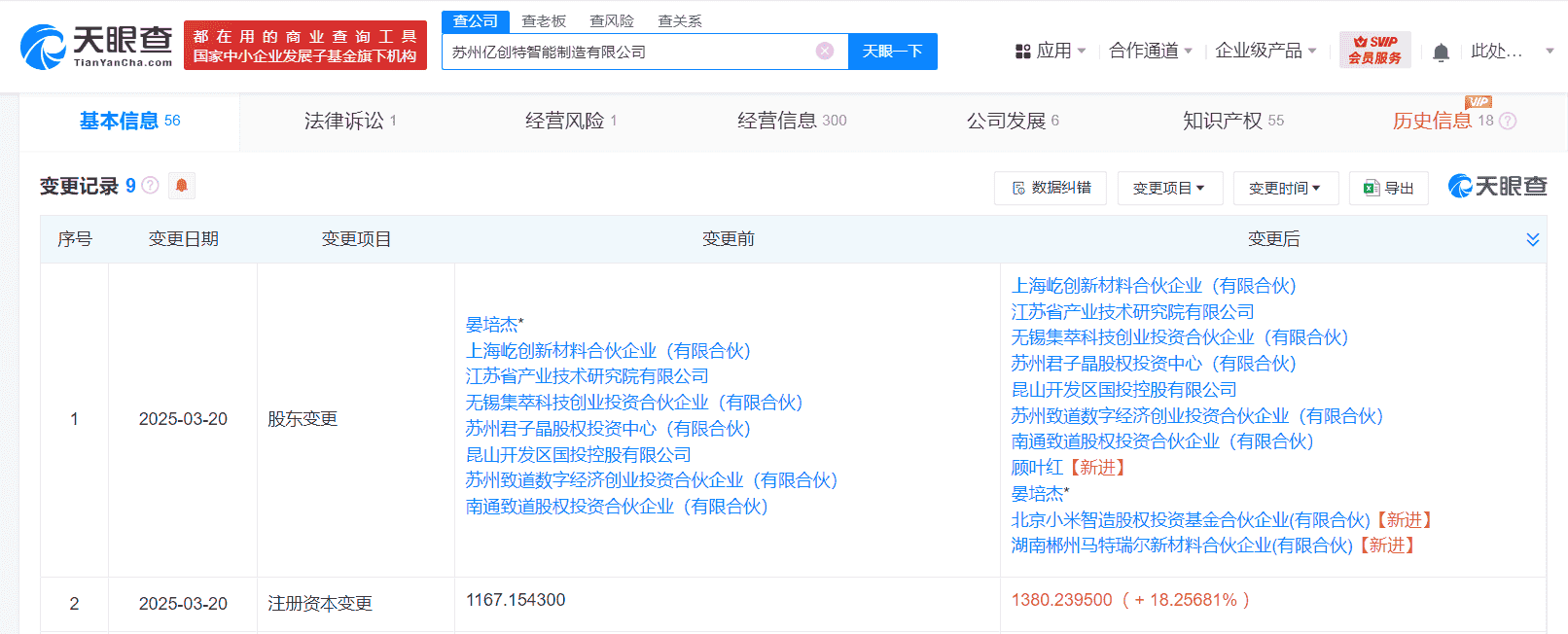 近期,苏州亿创特智能制造有限公司的工商注册信息发生了重要变动,引入了多位新股东并增加了注册资本。据天眼查App的最新数据显示,北京小米智造股权投资基金合伙企业(有限合伙)、湖南郴州马特瑞尔新材料合伙企业(有限合伙)以及个人股东顾叶红正式成为该公司的新增股东。