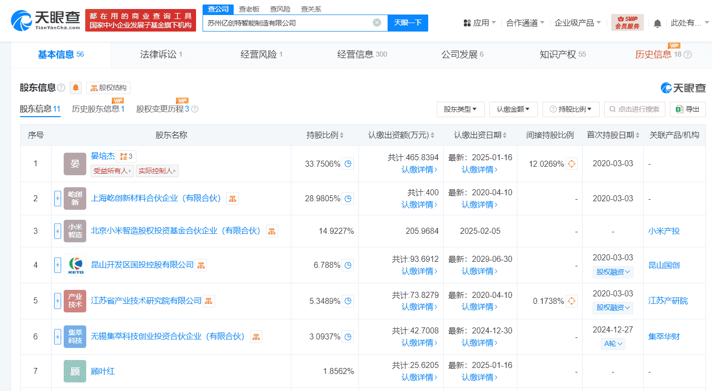 据天眼查信息显示,目前苏州亿创特智能制造有限公司的股权结构已发生显著变化,除了原有股东晏培杰、上海屹创新材料合伙企业(有限合伙)以及昆山开发区国投控股有限公司外,新增的股东也正式加入其中,共同推动公司的发展。