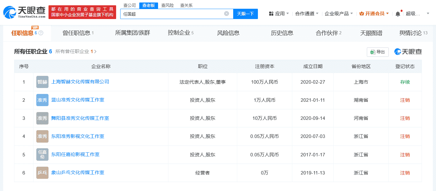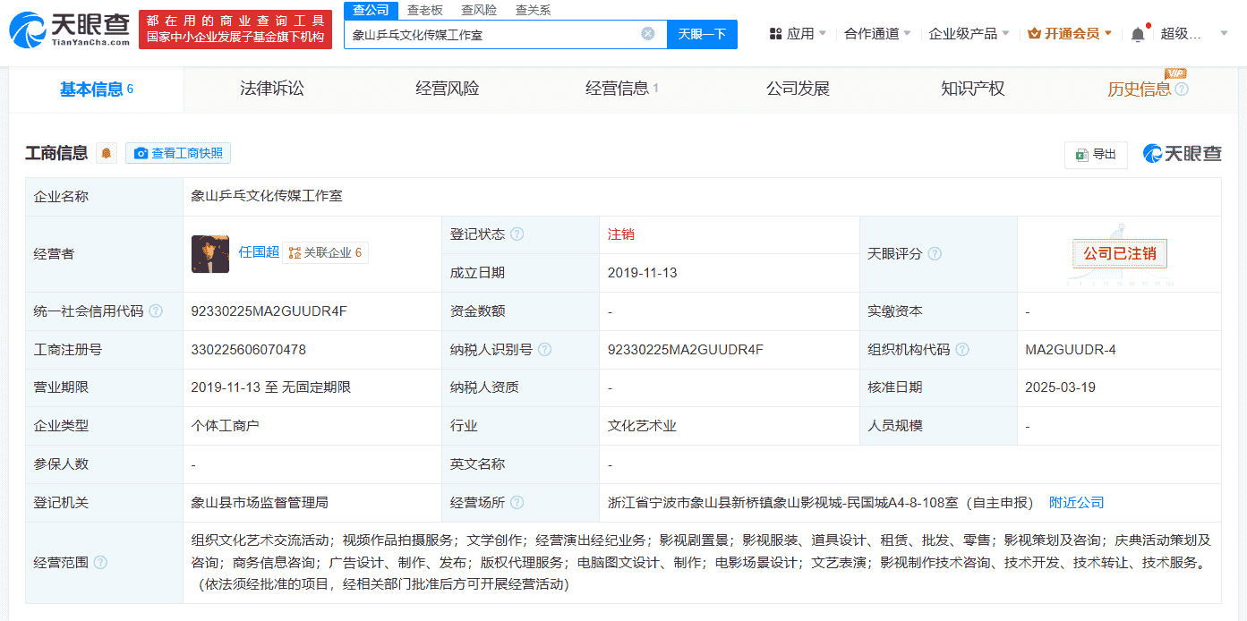 任嘉伦注销象山工作室,目前仅保留一家公司运营状态