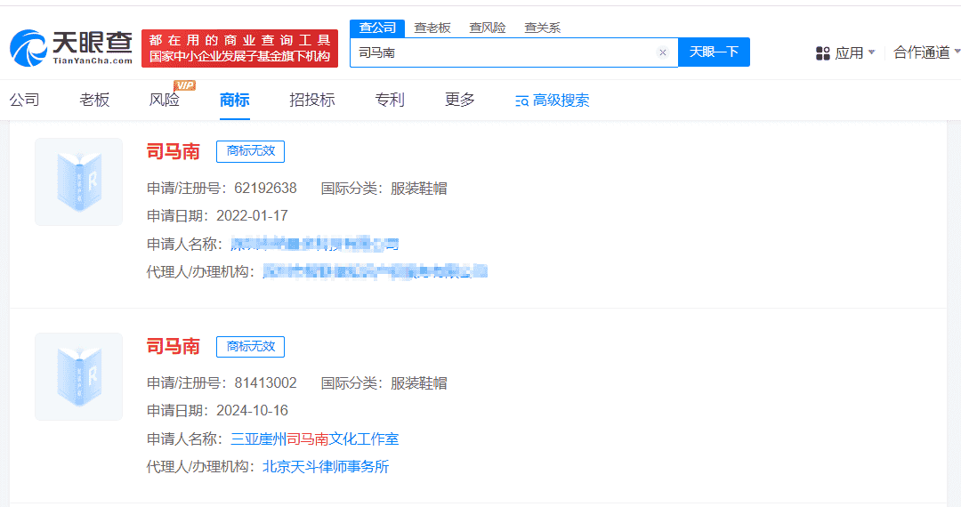 值得注意的是,“司马南”这一名称也被其他多家企业申请注册为商标。申请人包括广西、深圳、成都等地的科技公司及酒业公司等,涉及的国际分类包括服装鞋帽、啤酒饮料等。然而,据天眼查数据显示,部分此类商标申请已被驳回,目前处于无效状态。