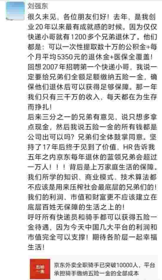 在分享中,刘强东强烈呼吁所有快递和外卖平台的从业者都能享受到五险一金的待遇。他认为,当前中国几大平台的利润和市值已经足够支撑这一改善,这是对所有基层劳动者辛勤付出的尊重和回馈。