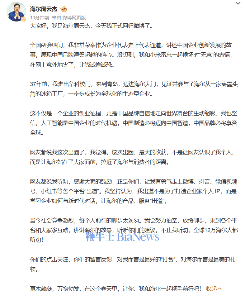 海尔CEO周云杰抖音首秀,官宣回归微博:倾听用户,共话创新