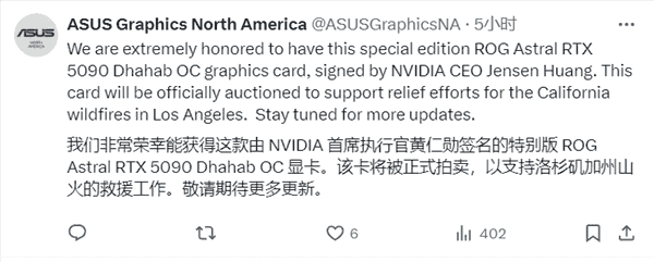 华硕方面表示,能够获得NVIDIA CEO黄仁勋签名的这款特别版显卡,是公司的一大荣幸。更令人动容的是,华硕决定将此显卡进行拍卖,拍卖所得将全部捐赠给洛杉矶加州野火的救援工作,这一善举无疑为这款奢华显卡增添了几分温暖的人文关怀。