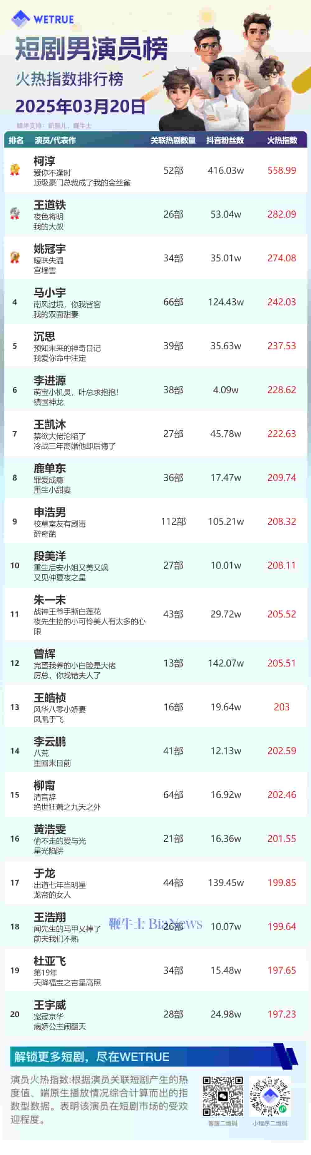 3月20日短剧演员火热指数揭晓:孙艺燃、柯淳登顶冠军宝座