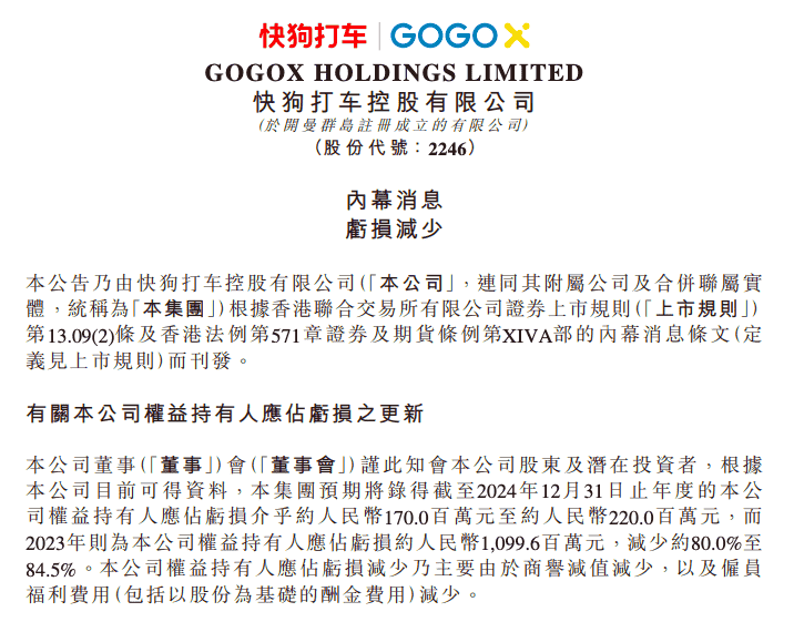 快狗打车2024财年预计大幅减亏,权益持有人亏损缩窄80%-84.5%