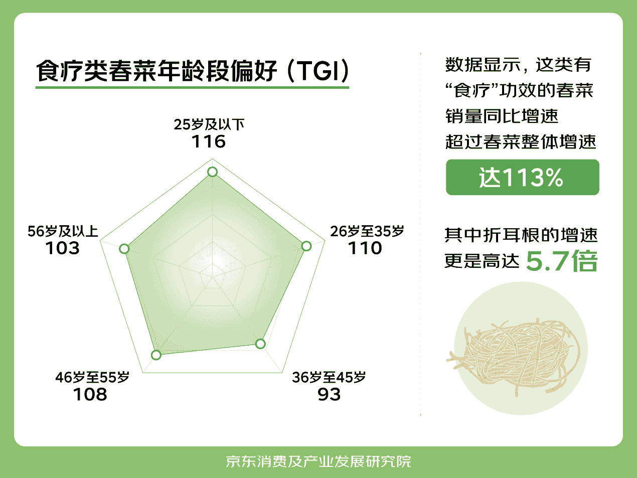食疗功效也成为消费者选择春菜的重要因素之一。调查显示,超过半数的消费者在购买春菜时会考虑其食疗功效。板蓝根青菜、蒲公英、折耳根等具有药食同源特性的春菜因此销量大增,同比增速远超整体市场。尤其是年轻消费者群体,他们对这类春菜的购买热情最高,将“边吃边养生”的生活方式践行得淋漓尽致。