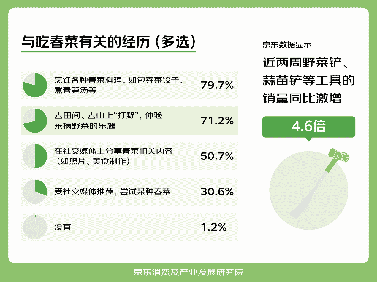 春菜的流行不仅仅局限于餐桌之上,它还承载着许多人的童年记忆和情感寄托。许多消费者表示,摘野菜、吃春菜是他们童年时光中不可或缺的一部分。随着春季的到来和吃春风潮的兴起,挖野菜也成为了都市人群踏春的新选择。数据显示,近两周来野菜铲、蒜苗铲等工具的销量同比激增了4.6倍,足见这一潮流的火爆程度。