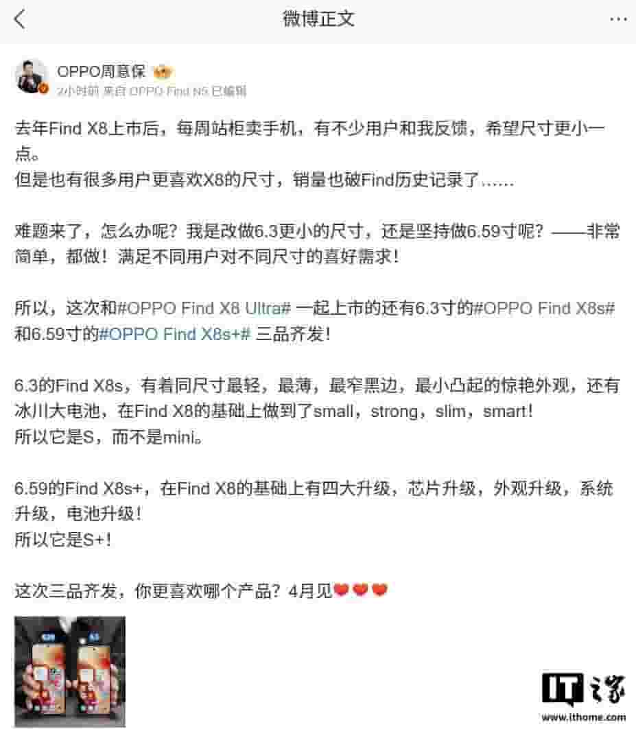 为了更全面地展示新机型的魅力,周意保还通过视频分享了更多详细信息。据悉,四月即将发布的Find系列新品包括三款机型:被誉为“行业影像旗舰”的OPPO Find X8 Ultra、“小屏影像旗舰”OPPO Find X8s以及之前提到的OPPO Find X8s+。这三款新机的问世,无疑将为用户带来更加丰富的选择。