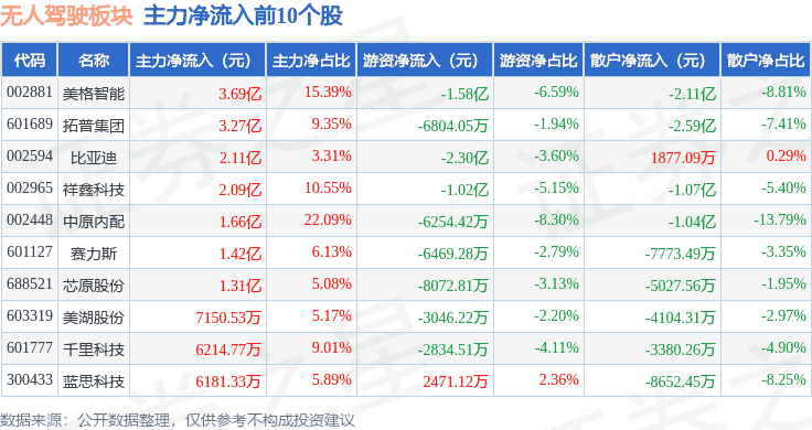 个股资金流向的数据进一步揭示了市场参与者的不同看法。尽管主力资金选择撤离,但游资和散户资金的涌入为无人驾驶板块提供了一定的支撑。这种资金流动的分化现象,或许预示着该板块在短期内将面临更为复杂的行情走势。