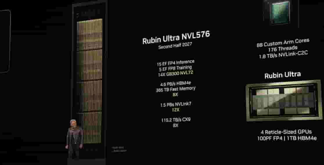 展望未来,英伟达真正的下一代芯片Rubin更是令人期待。单芯片FP4性能提升至25 PFLOPS,双芯片设计的Rubin则高达50 PFLOPS,是Blackwell Ultra的三倍以上。显存也升级为HBM4,带宽从8TB/s跃升至13TB/s,NVLink状态下吞吐量更是达到前代的两倍。Rubin支持NVL144,即单个机柜最高可串联144颗芯片,提供高达3.6EF的FP4算力,远超当前Blackwell Ultra的水平。