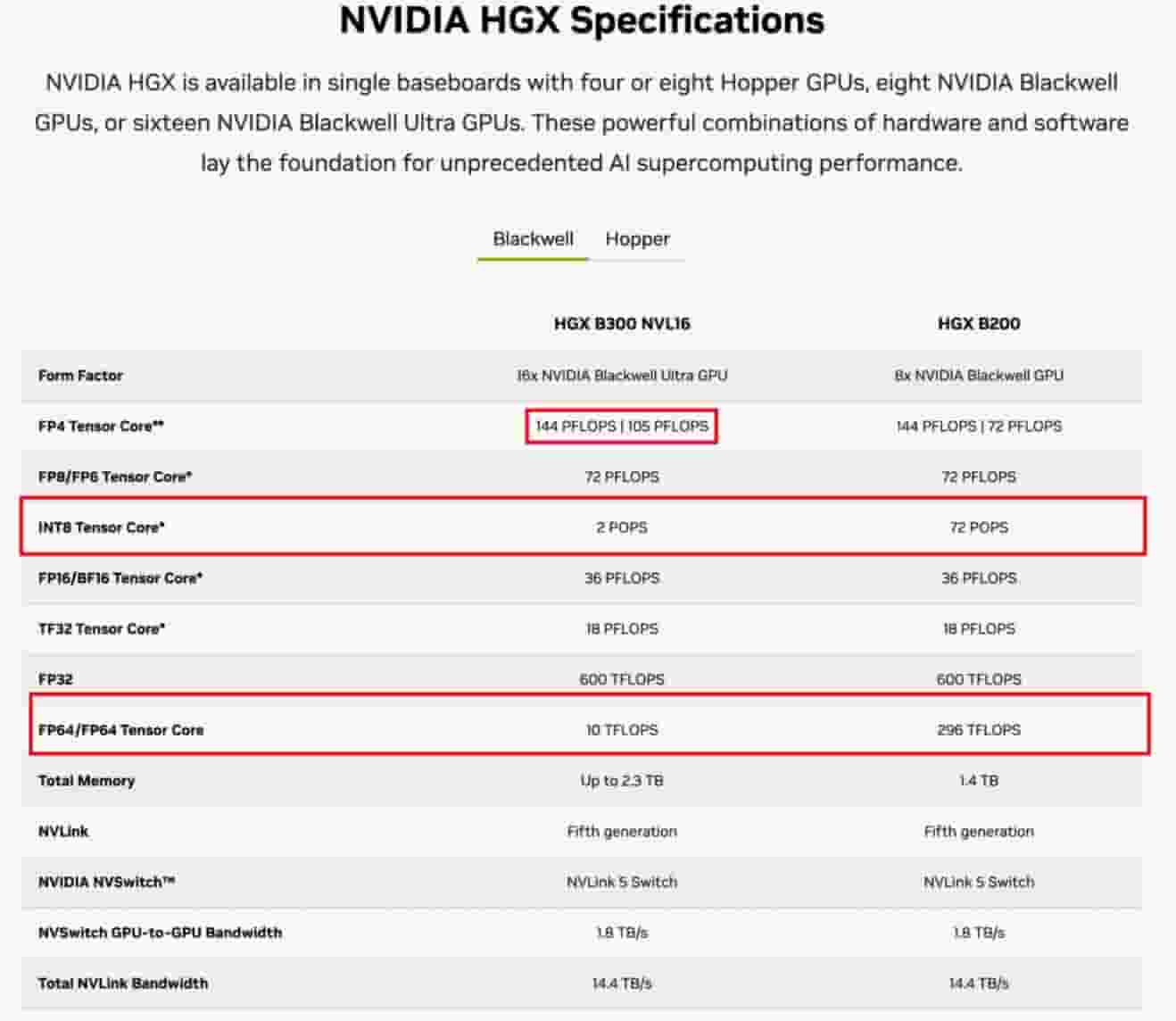 英伟达在发布会上强调,Blackwell Ultra的显存已升级至288GB,在NVL72状态下,其AI性能是前代GB200的1.5倍。尽管这一提升幅度相较于从Hopper架构到Blackwell架构的飞跃略显保守,但英伟达着重指出,FP4推理性能提高了50%。这一提升得益于算力资源的重新分配,FP4推理性能的提升是以牺牲FP64和INT8推理性能为代价的。