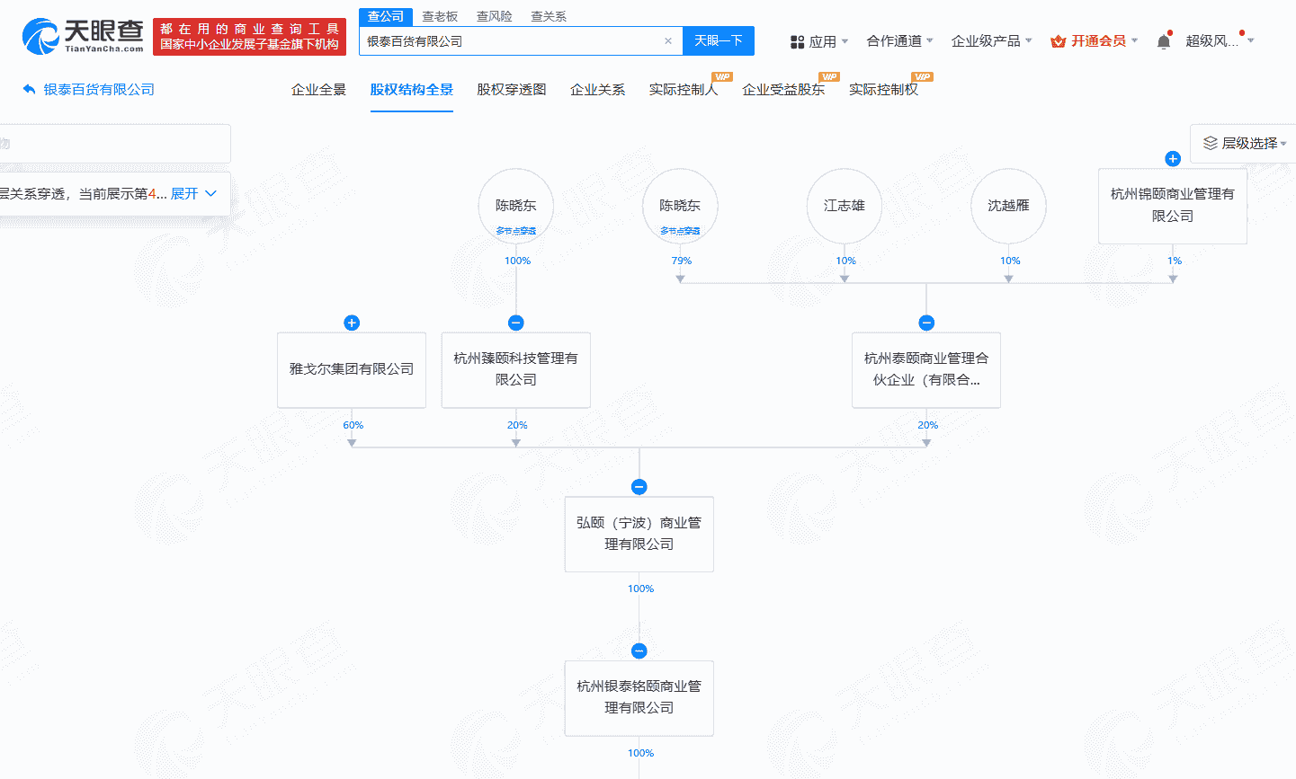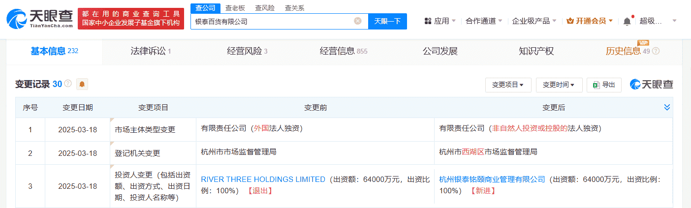 近期,银泰百货有限公司的股权结构发生了重大调整。据天眼查信息显示,原股东RIVER THREE HOLDINGS LIMITED已经退出该公司的股东行列,取而代之的是雅戈尔集团旗下的杭州银泰铭颐商业管理有限公司,后者实现了对银泰百货的全资控股。