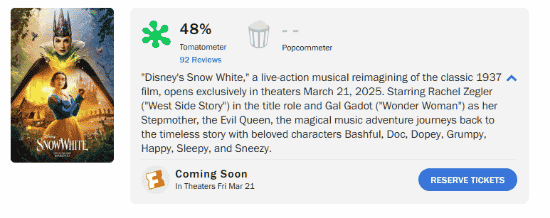 迪士尼真人版《白雪公主》的媒体评分近日揭晓,引发了广泛关注。据知名影评平台统计,该电影已收获了92篇专业影评,但其新鲜度却仅维持在48%的较低水平。